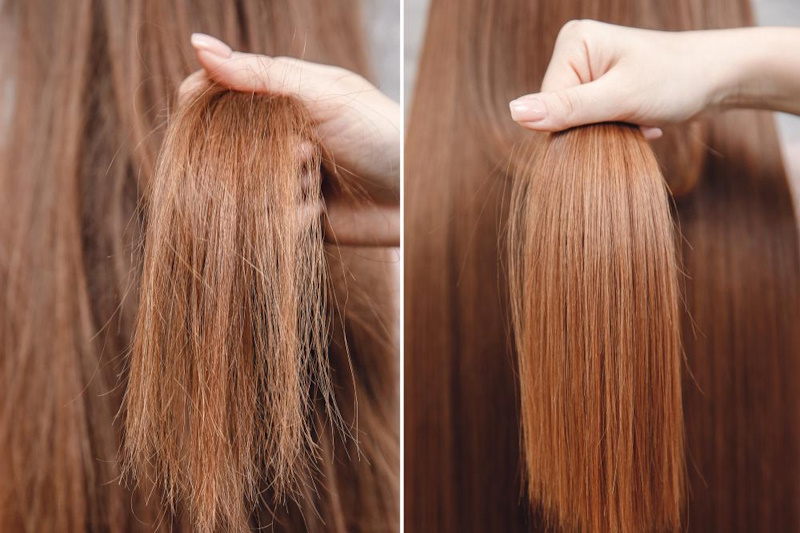 Кератинове випрямлення відоме своєю здатністю змінювати архітектуру волосся. Склади на основі амінокислот, олій та активних реконструкторів забезпечують стійке розгладження. Ідея проста: кутикула запаюється в більш рівному положенні, що дозволяє досягти візуальної гладкості та блиску. [Image of hair before and after keratin treatment]