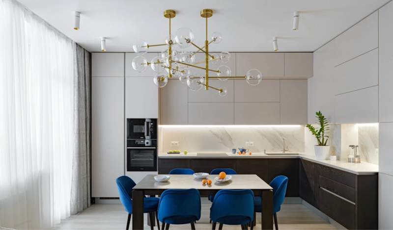 - Схему розташування світильників, люстр, LED-стрічок або декоративного підсвічування потрібно затвердити ще до початку монтажу. Натяжна конструкція завжди знижує рівень стелі, у середньому на 3−5 см, а при встановленні точкових світильників, трекових систем чи багаторівневих рішень – на 7−15 см. Для приміщень із низькими перекриттями це може бути критично, тому тип освітлення варто підбирати з урахуванням висоти кімнати.