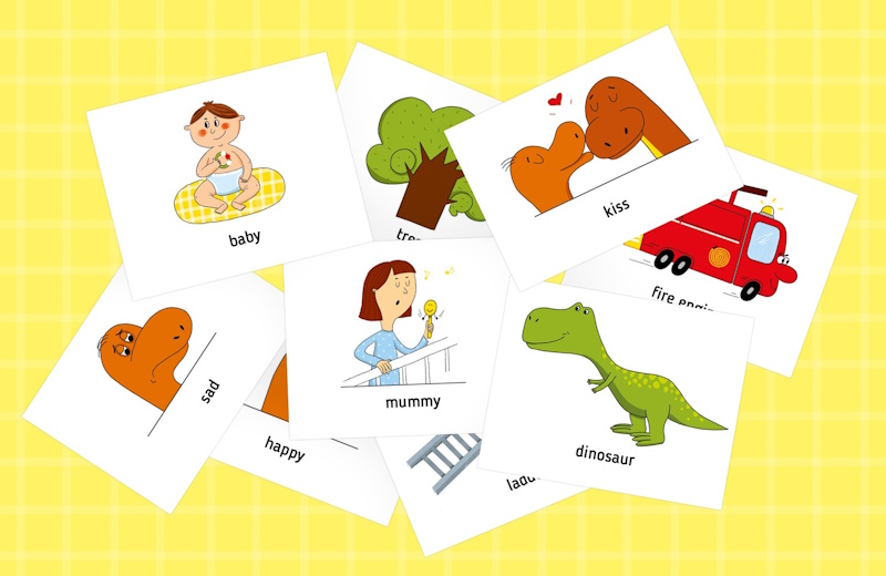 - наявність тематичних наборів — подорожі, їжа, тварини, дієслова.